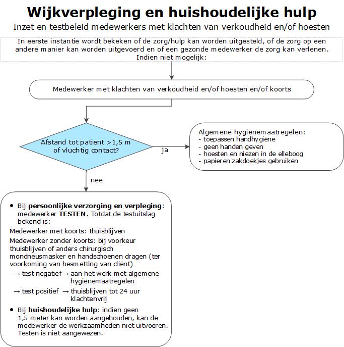 Het Landelijke coördinatie infectieziektebestrijding (LCI Landelijke coördinatie infectieziektebestrijding) heeft de uitgangspunten voor een optimale inzet van medewerkers in de zorg gepubliceerd: Uitgangspunten inzetten en testen zorgmedewerkers. Deze algemene uitgangspunten zijn voor verschillende sectoren vertaald naar een sectorspecifiek advies, klik op de link voor het advies voor zorgpersoneel wijkverpleging en huishoudelijk hulp: