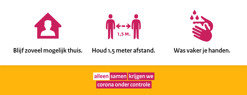 Ga alleen naar buiten als dat nodig is. Bijvoorbeeld om boodschappen te doen, of voor een frisse neus. Werk thuis als het kan. Houd 1,5 meter afstand van anderen (2 armlengtes). Ook op straat, in de supermarkt en in het park. Was uw handen meerdere keren per dag met water en zeep.